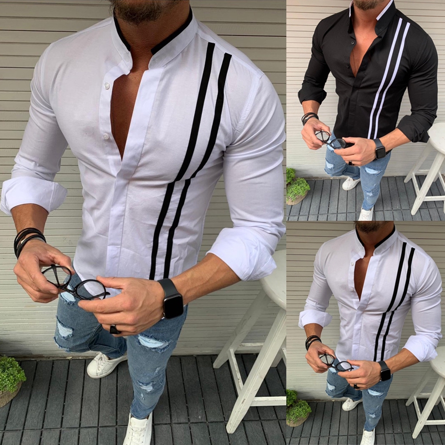 Mens Stripe Stitching Casual Slim Fit Baju Lelaki Fashion Kemeja Lelaki Business Gentleman Long Sleeve Men Shirt Shopee Malaysia