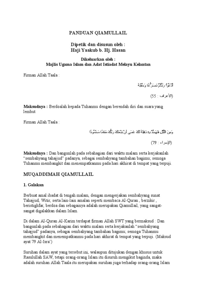 Dan juga kita juga disarankan untuk mengerjakan qiamullail. Oleh nurul kasmadillawati zakaria. Panduan qiamullail qpendahuluan iamullail ialah satu amalan sunat yang bererti bangun malam iaitu bangun dengan tujuan untuk beribadat kepada allah swt amalan qiamullail bukanlah satu perkara baru bahkan ianya merupakan ibadat yang sudah menjadi darah daging atau amalan para rasul nabi nabi orang soleh dan alim ulama sejak dahulu lagi. Namun bukankah sebaik baik amalan adalah amalan yang sedikit namun berpanjangan.