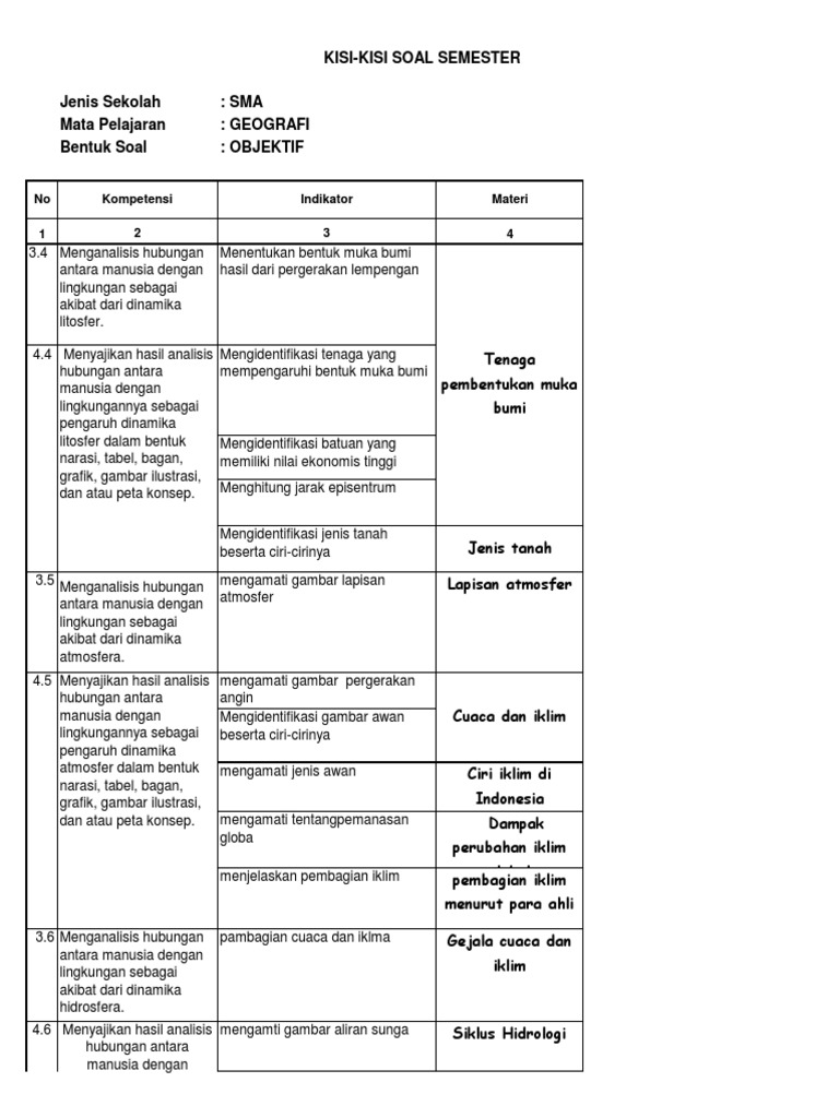 Kisi Kisi Geografi Kelas X K 13 Smt Genap Xlsx