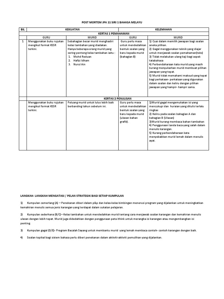 Post mortem posted by cikgu bahasa at. Dengan itu murid akan lebih fokus dalam pengajaran dan pembelajaran. Daripada 18 orang murid mendapat markah penuh 20 20 dan hanya 1 orang mendapat markah 19 20 melalui latihan tersebut post mortem yang dibuat adalah seperti berikut.