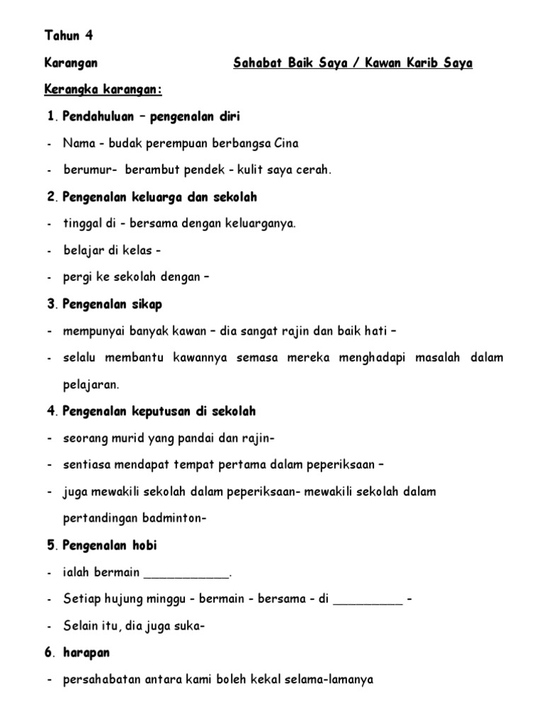 Tahun 4 Karangan Sahabat Baik Saya Kawan Karib Saya Kerangka Karangan 1 Pendahuluan Pengenalan Diri