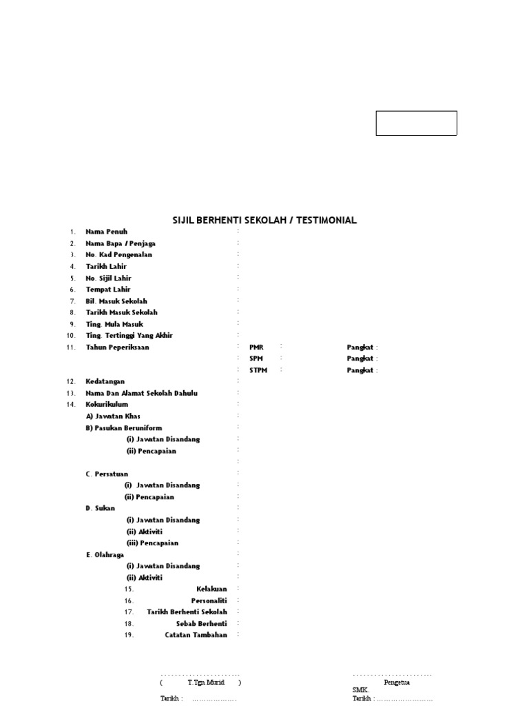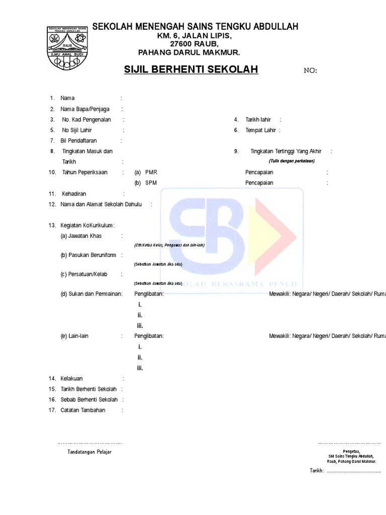 Nama dan alamat sekolah dahulu name and address of former school. So tak payah tunggu lama lama. Proses memuktamadkan dokumen sijil berhenti sekolah dan surat akuan terletak di bawah bidang tugas penolong kanan hal ehwal murid. Sijil ini selalunya diberikan kepada murid yang telah berhenti sekolah dan kebanyakan sekolah telah ada sijil kosong yang perlu di cetak diatasnya.